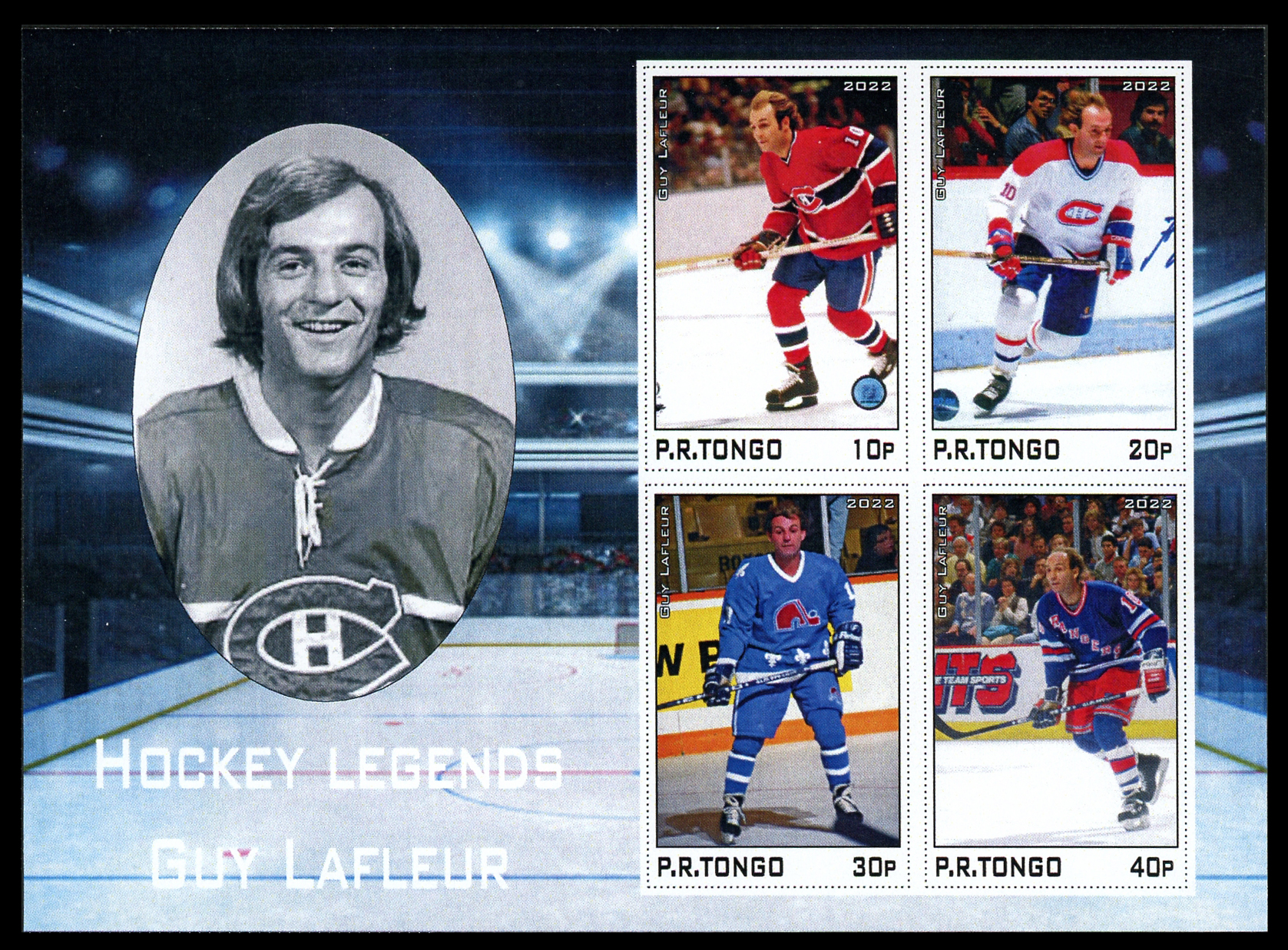Click here for higher resolution image | First day of issue: Date unknown Width: 138 mm Height: 99 mm Perforation: Imperforate Location: Ice Hockey Volume LXXII Stamp ID = 7292 This collective sheet has 1 copy each of the following four items Cinderella, collective sheet shows Guy Lafleur Imaginary country. No information about this country available but one source on-line thought that labels coming from P.R.Tongo are produced by a company in the Netherlands. |
