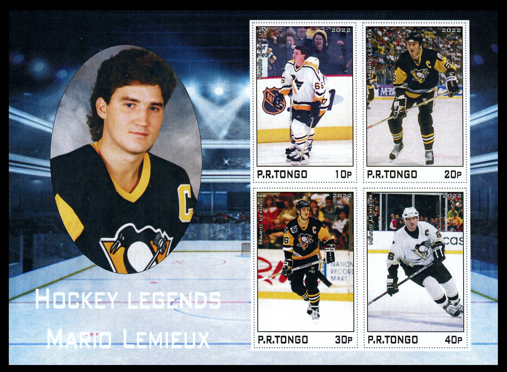 Click here for higher resolution image | First day of issue: Date unknown Width: 138 mm Height: 99 mm Perforation: Imperforate Location: Ice Hockey Volume LXXII Stamp ID = 7302 This collective sheet has 1 copy each of the following four items Cinderella, collective sheet shows Mario Lemieux Imaginary country. No information about this country available but one source on-line thought that labels coming from P.R.Tongo are produced by a company in the Netherlands. |