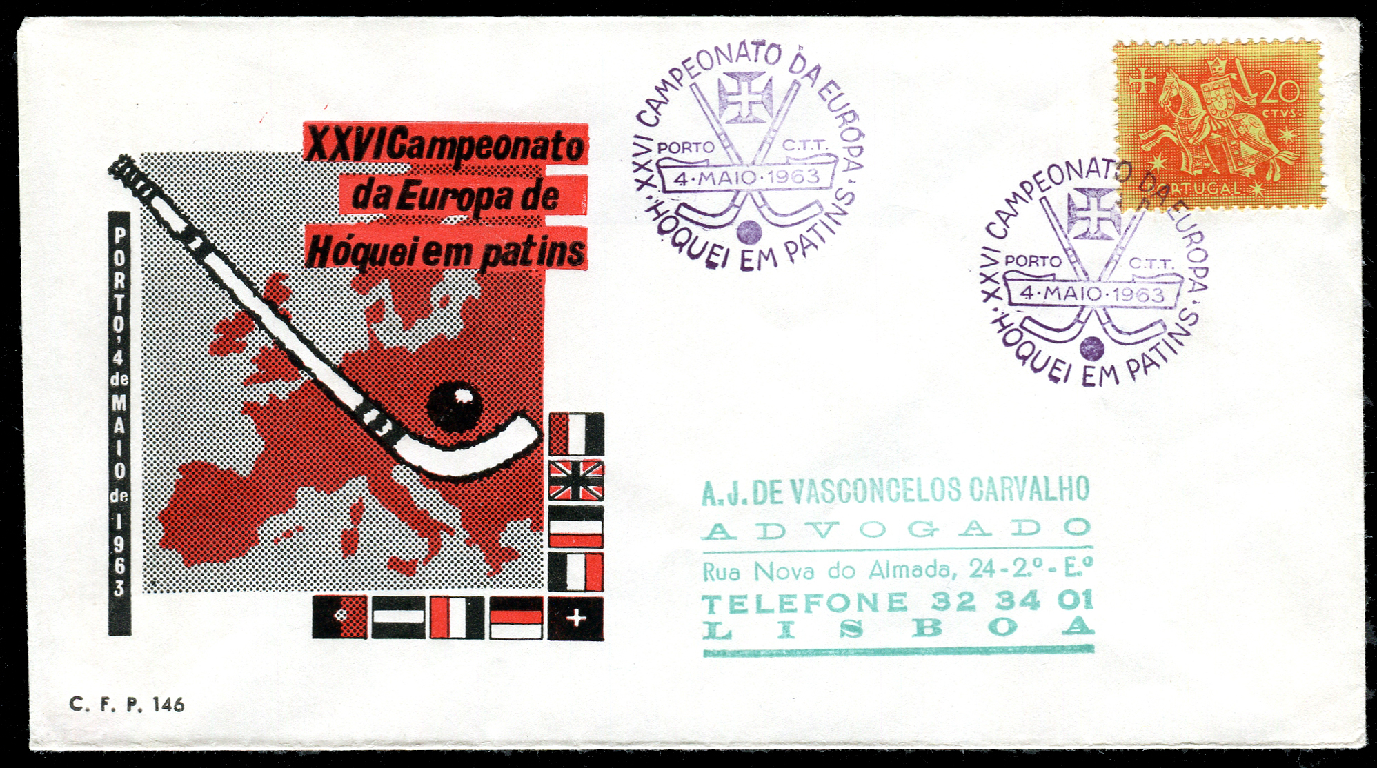 Click here for higher resolution image | First day of issue: May 04, 1963 Width: 162 mm Height: 92 mm Location: Roller hockey Stamp ID = 4213 Cachet for the 1963 European Roller Hockey Championships in Porto, Portugal. From Linn's "Stamp Issuing Entities Of The World" page. Portugal (1853-) Stamp-issuing status: active; Population: 9,867,654 (1997 estimate). A republic on the western coast of the Iberian Peninsula in southwest Europe. |