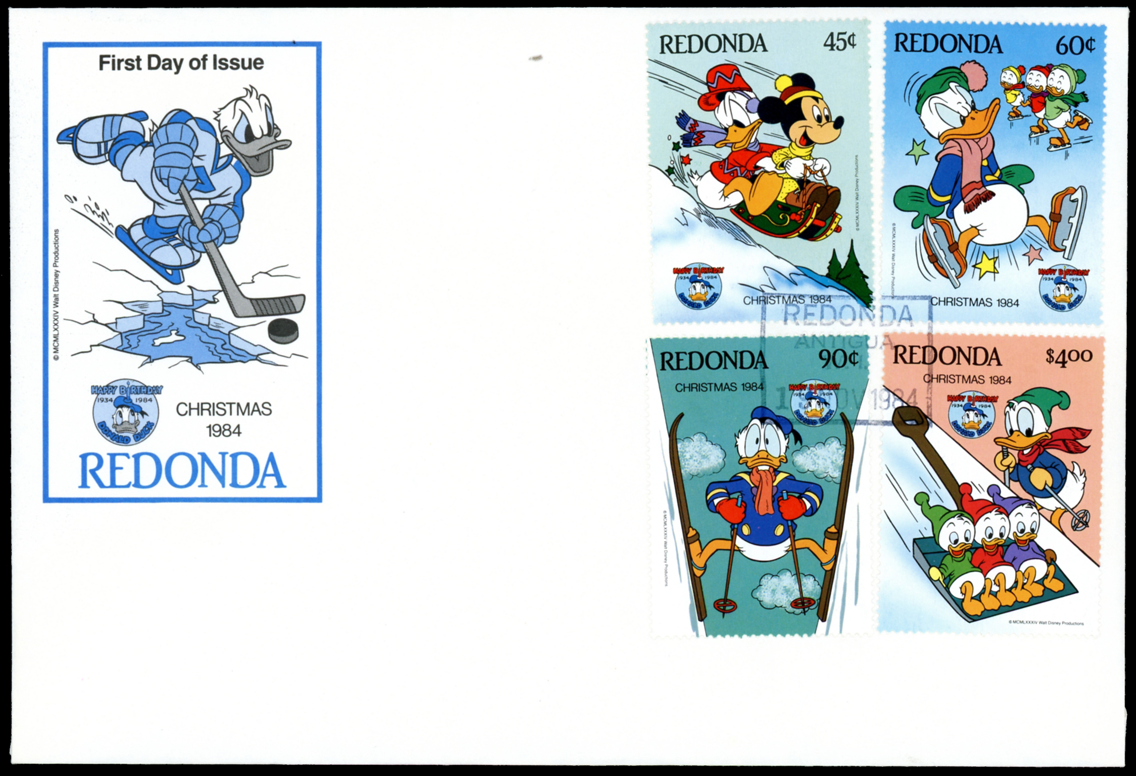 Click here for higher resolution image | First day of issue: November 19, 1984 Width: 184 mm Height: 124 mm Location: Oversize album #15 Stamp ID = 6247 From Linn's "Stamp Issuing Entities Of The World" page. Redonda (1979-91) Stamp-issuing status: inactive; Population: 0. A steep, guano-covered rock one-half mile square in the eastern Caribbean between Montserrat and Nevis, owned by Antigua. Antiguan stamps overprinted "REDONDA" were introduced in 1979, with purpose-designed issues on a variety of popular topics following later that year. These were postally valid on Antigua, since Redonda has neither postal service nor inhabitants. |