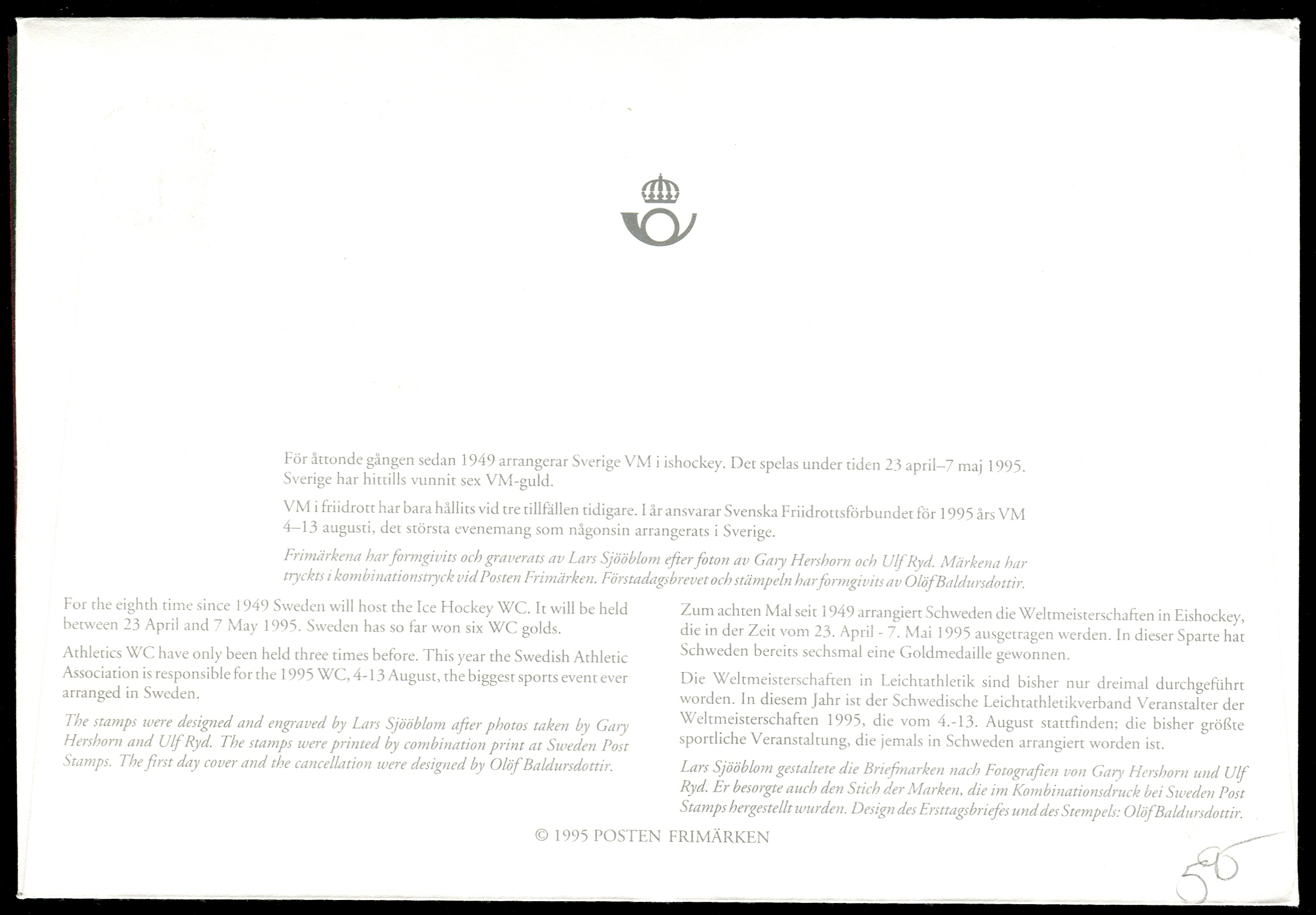 Click here for higher resolution image | First Day Cover for swe-19950317-s-001 First day of issue: March 17, 1995 Width: 174 mm Height: 122 mm Cachet maker: Unknown Location: Ice Hockey Volume LXXXVI Idfdc = 573 From Linn's "Stamp Issuing Entities Of The World" page. Sweden (1855-) Stamp-issuing status: active; Population: 8,946,193 (1997 estimate). Constitutional monarchy in northern Europe, occupying the eastern portion of the Scandinavian Peninsula. |