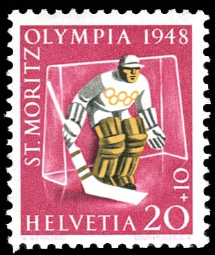 Click here for higher resolution image Click here to see FDC's | First day of issue: January 15, 1948 Occasion: 1948 Winter Olympics,1948,St. Moritz,Switzerland Width: 20 mm Height: 25 mm Perforation: Perforated 11.50 x 11.50 Printing method: Engraved Catalog number: Scott B172 Zumstein 27w. Michel 494 Location: Ice Hockey Volume LXXXVII Stamp ID = 3551 First stamp to show an ice hockey player. From Linn's "Stamp Issuing Entities Of The World" page. Switzerland (1850-) Stamp-issuing status: active; Population: 7,248,984 (1997 estimate). A land-locked federation in central Europe, situated between France, Germany, Austria and Italy. The country has three official languages: German, French and Italian.In addition from Wikepedia |